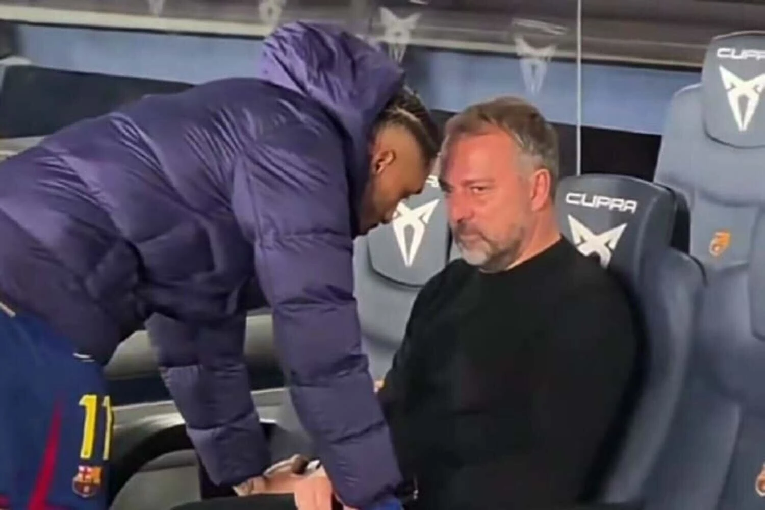 Kamery uchwyciły specyficzną reakcję Hansiego Flicka na ten sukces. Niemiec siedział ze skwaszoną miną na ławce rezerwowych. Pocieszyć szkoleniowca próbował Raphinha.
