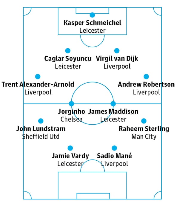 Kasper Schmeichel (Leicester City); Trent Alexander-Arnold (Liverpool), Virgil van Dijk (Liverpool), Caglar Soyuncu (Leicester City), Andrew Robertson (Liverpool), John Lundstram (Sheffield United), Jorginho (Chelsea), James Maddison (Leicester City), Raheem Sterling (Manchester City), Sadio Mane (Liverpool), Jamie Vardy (Leicester City).