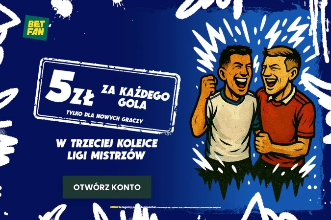 BETFAN proponuje ciekawą promocję dla nowych użytkowników - 5 złotych bonusu za każdego gola w trzeciej serii gier Ligi Mistrzów. Dla przykładu - w pierwszej kolejce padło 67 bramek, co oznaczało bonus w wysokości 335 złotych.